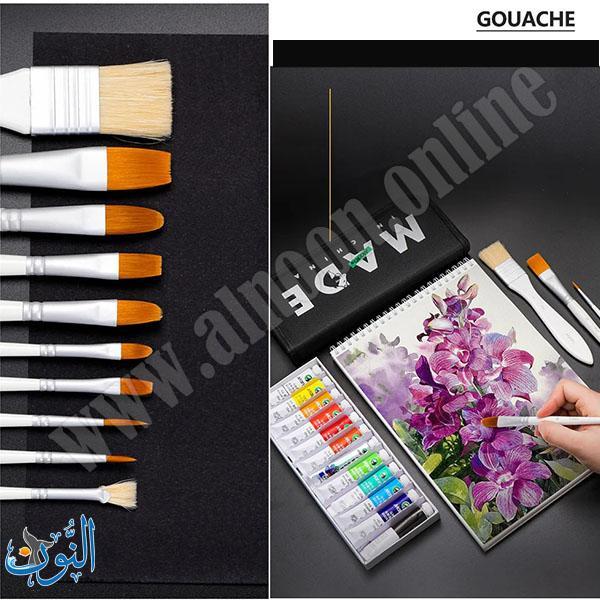 مجموعة متكاملة مكوّنة من 10 فراشي عالية الجودة، صُمّمت لتناسب خصائص ألوان الغواش التي تجمع بين الكثافة والشفافية، وتتيح أداءً فنيًا مرنًا يناسب المبتدئين والمحترفين على حدّ سواء. تأتي المجموعة داخل حقيبة حمل عملية تضمن ترتيب الفراشي وسهولة التنقل بها.